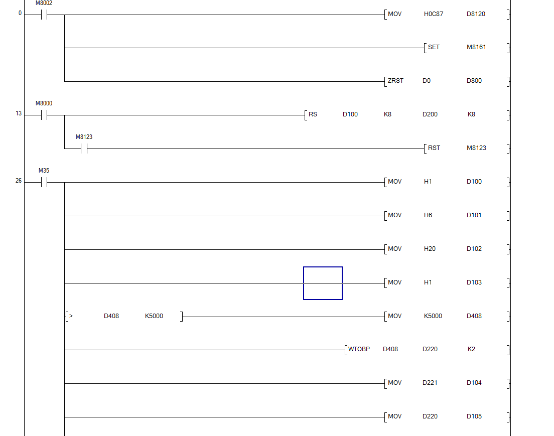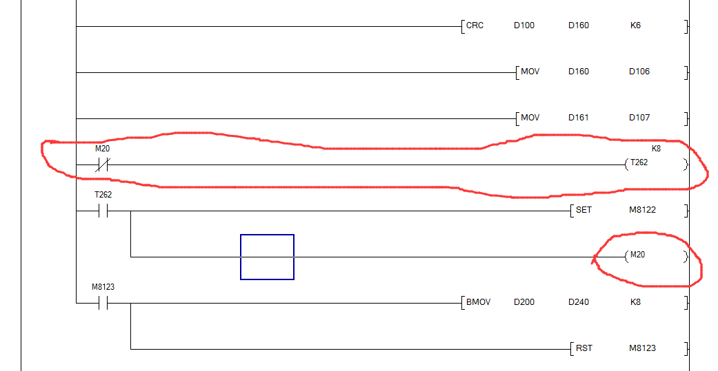 我這里只有向變頻器中寫入頻率的程序,為什么我要在M8122之前非得加個8ms的延時才能寫入,變頻器那里通訊相應延時我已經設置成0ms了,如果說非要加8ms的延時,我通訊的數據少還可以,如果說我要通訊16臺變頻,寫入啟動停止頻率之類的,再讀取一些監視信息,每個都要8ms,那這個周期就長了,有沒有大神來幫忙解惑下啊!!!