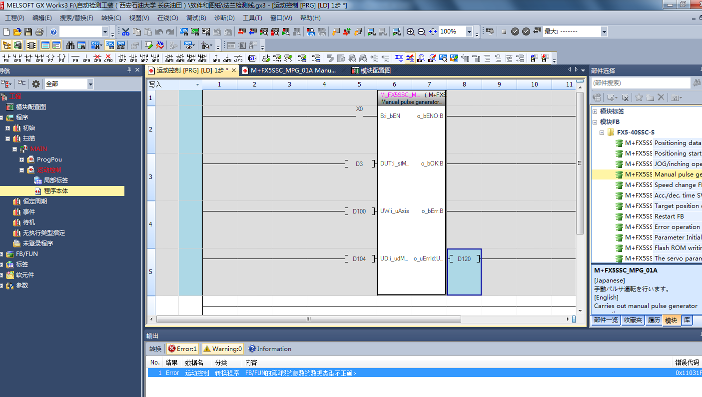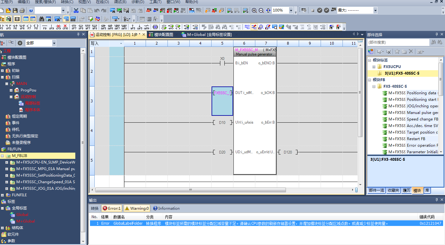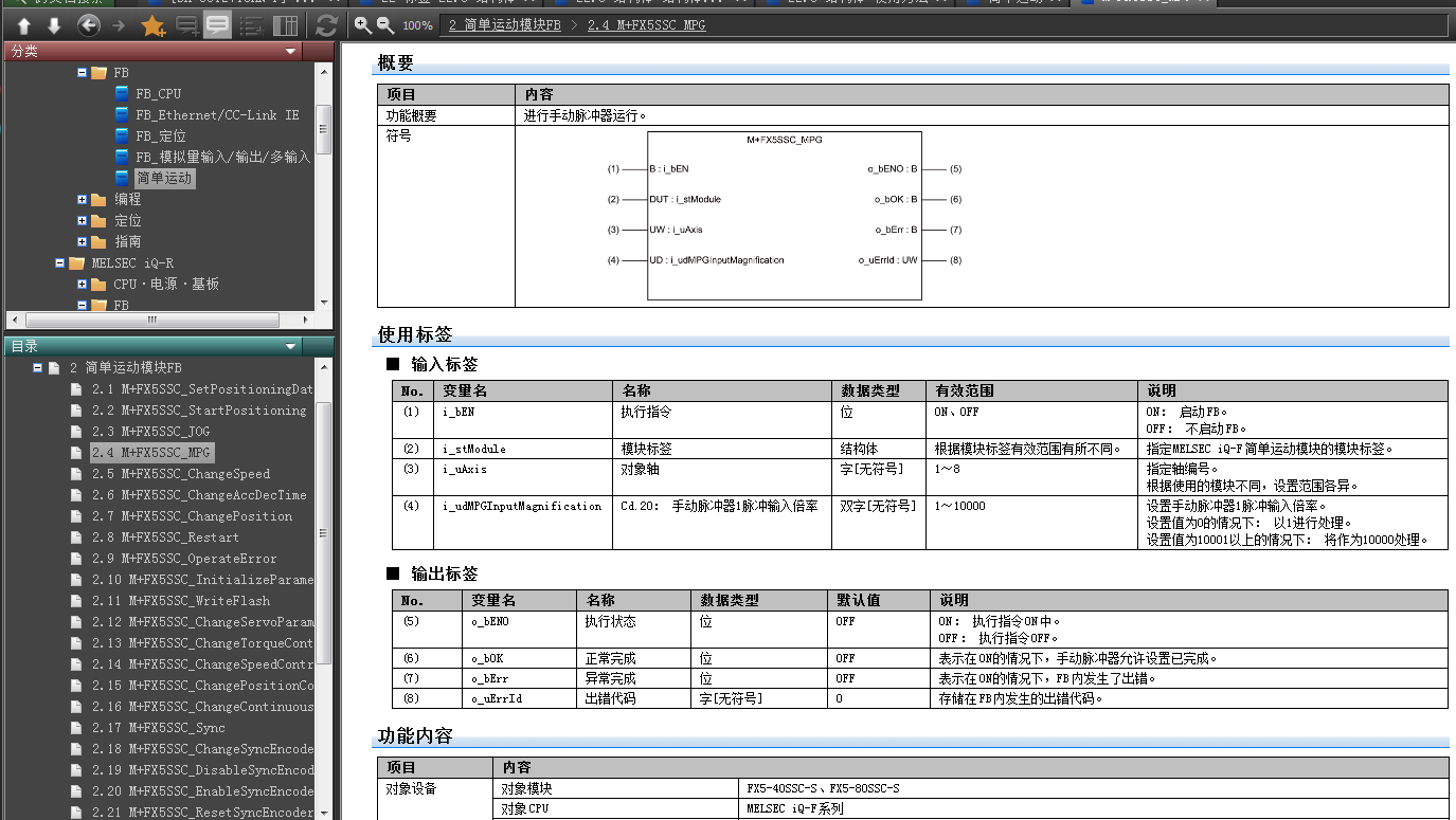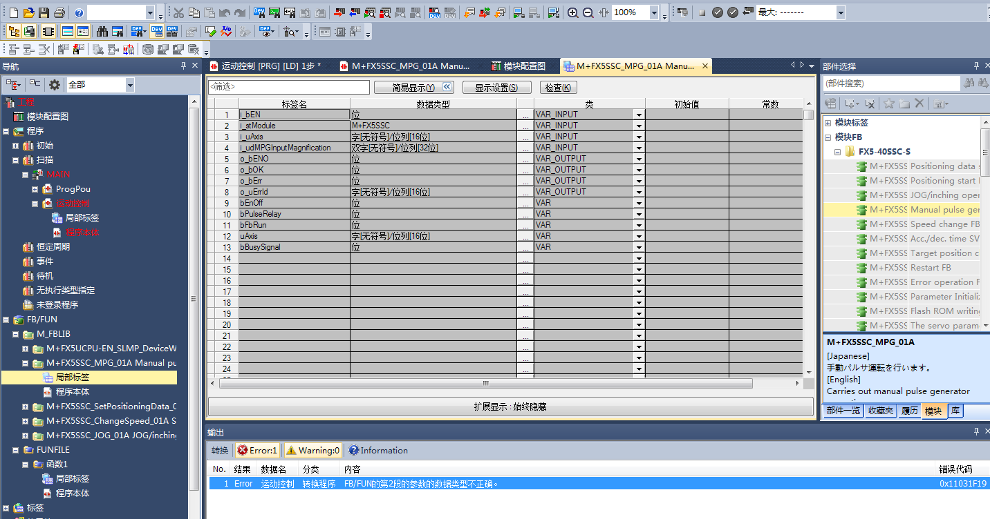 大家好,最近需要做一個工程,感覺FX5U的PLC 使用FX5SSC的簡易運動模塊孔子比較方便,畢竟可以光纖總線控制,驅動器上接線方便。可是在使用時,發現這個 FB不太好用,配置了FX5-40SSC-S模塊后,本想在lad里面插入FB(FX5-40SSC-S對應的 脈沖手輪控制FB),插入后,定義FB的輸入時,有個 輸入點,類型為DUT(結構體),不知如何賦值?請用過的朋友,幫忙指導,謝謝