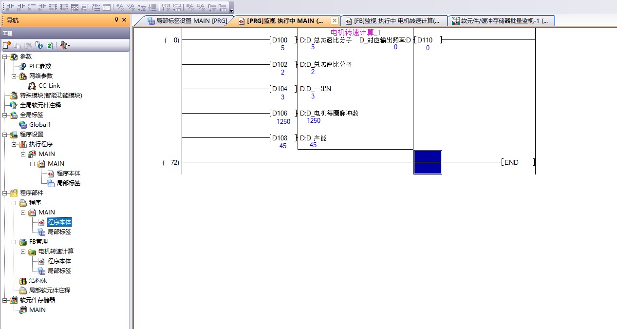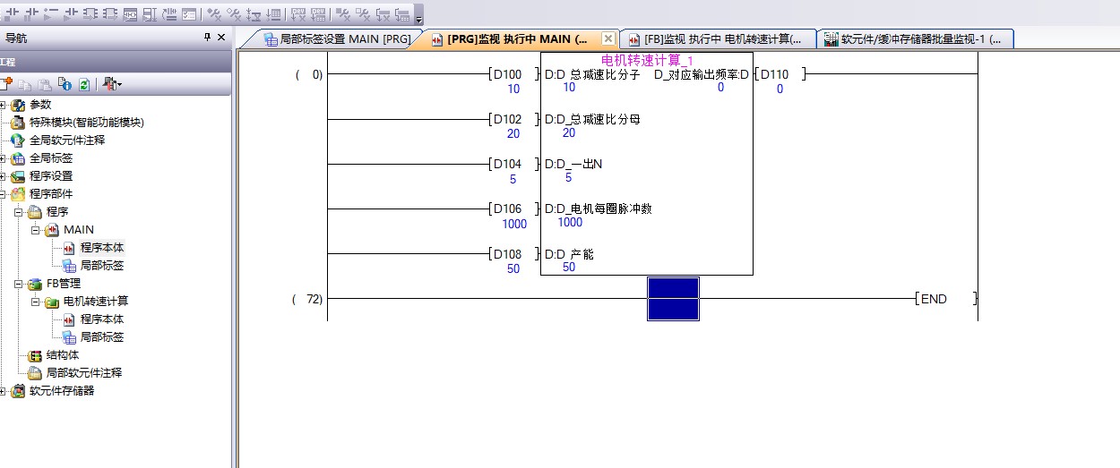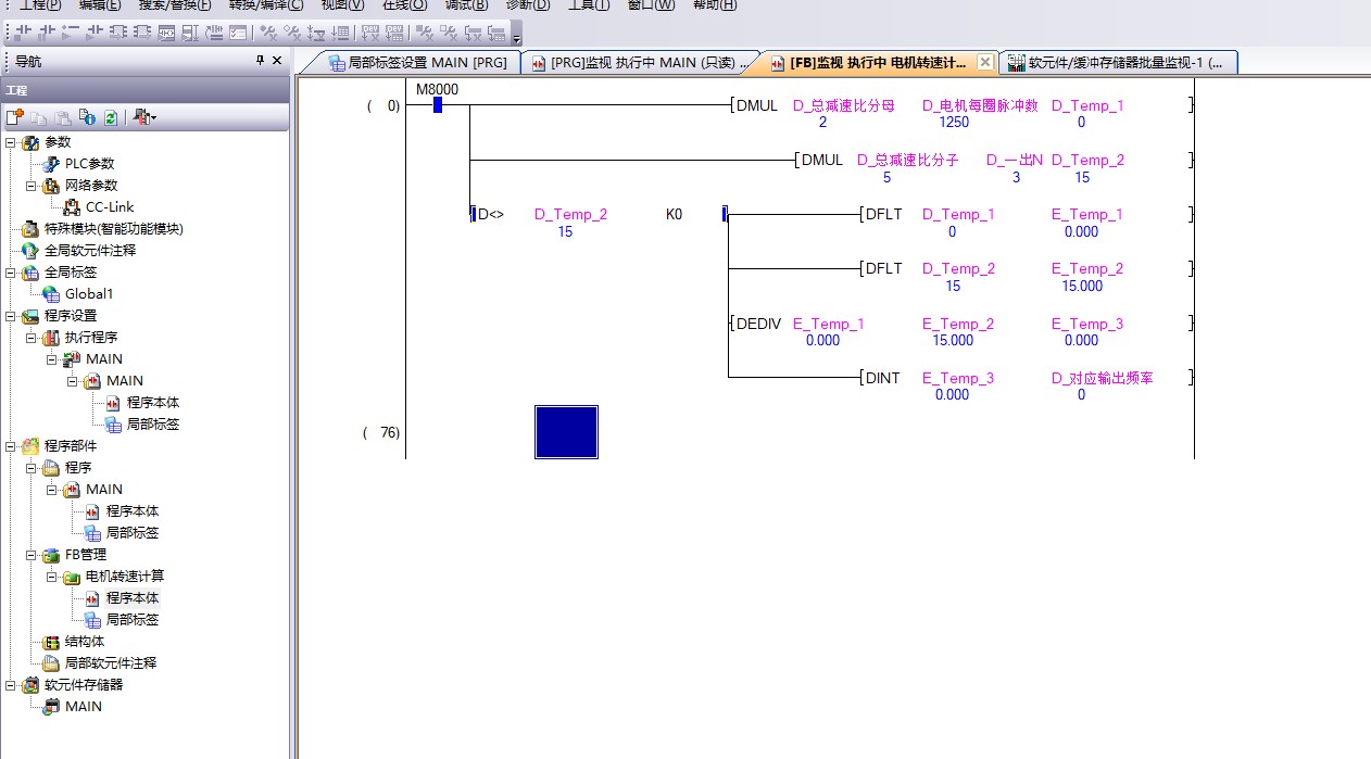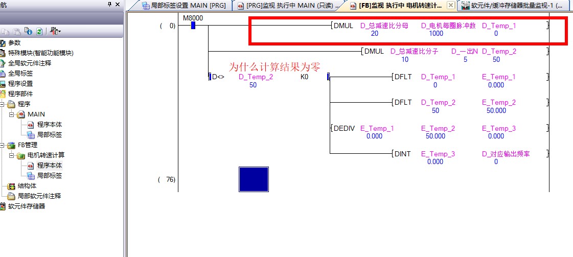 FX3U的PLC用標簽做了一個簡單的程序,程序簡單的很只是調用了一個FB而爾,搞不清楚在塊的第一行的運算結果始終為零,而其它的運算結果一切正常,求解!!!