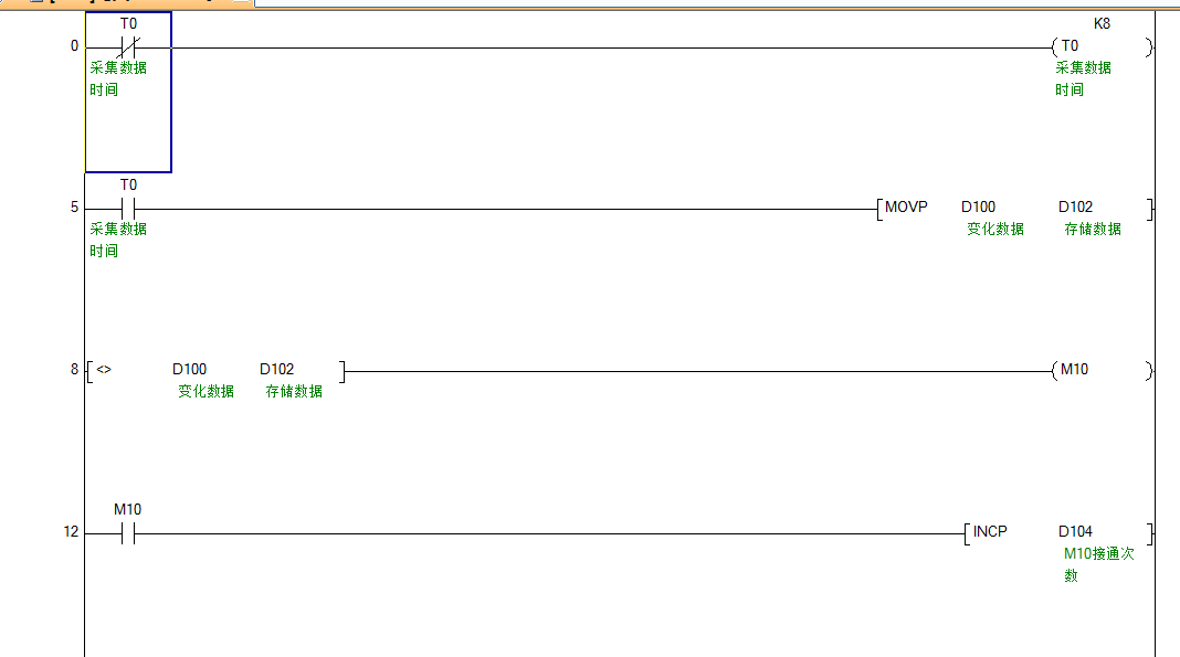 如題:寄存器數據有變化,使繼電器接通一次?如D100原來是K123,現在由K123變成K456,D100中的數據有變化使M10接通一次,要怎樣把程序寫出來?