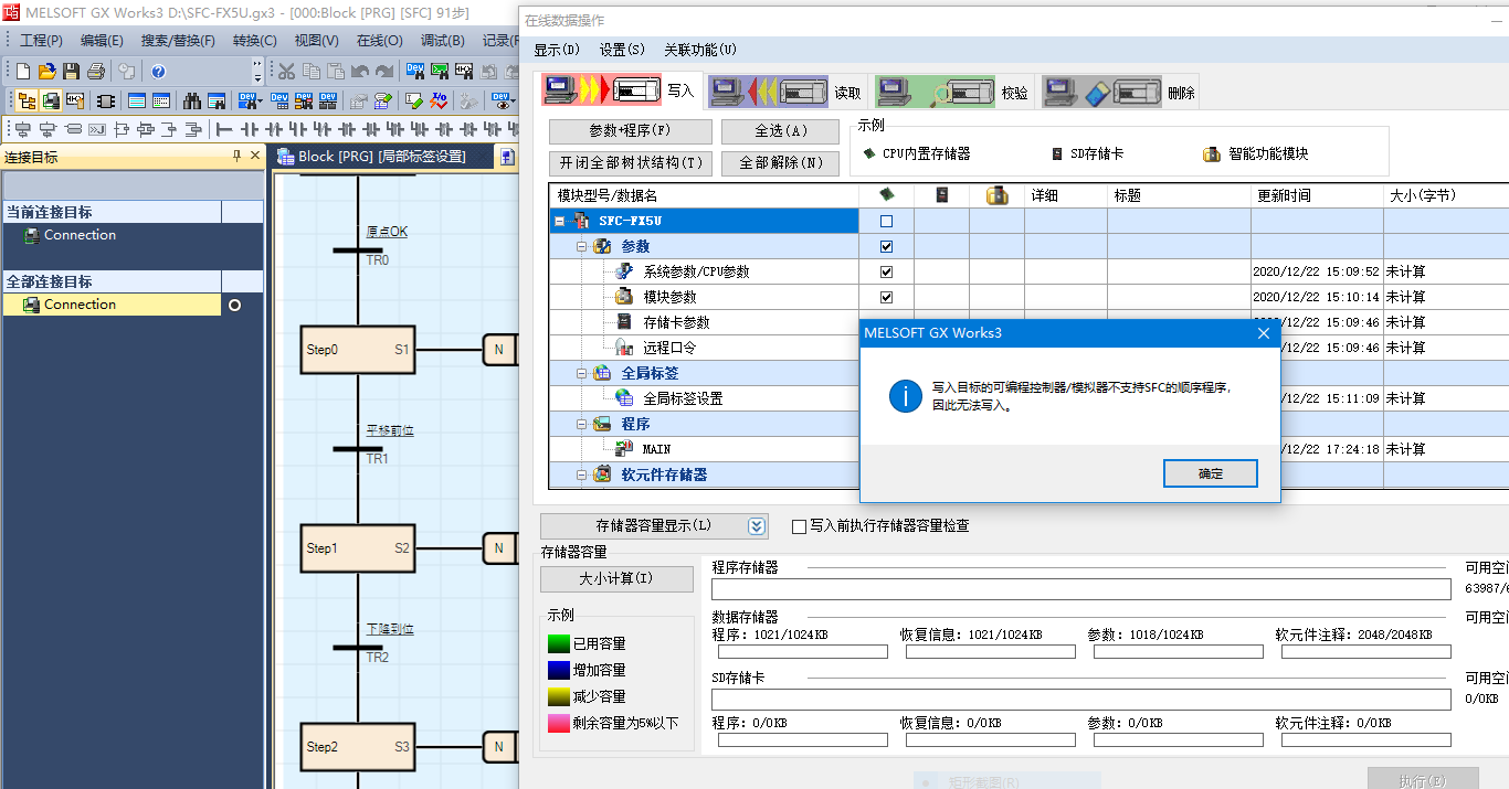 引用引用樓主zhongliang于2020-12-22 18:02發(fā)表的 FX5U SFC程序不能模擬和下載 :升級了GX Works3-1.070Y 發(fā)現(xiàn)FX5U也可以用SFC編程。于是就編寫了一個簡單的SFC程序,編譯沒有錯誤,但是不能下載和模擬。查找了一下相關手冊,說是固件版本要1.220”及以后才支持SFC. 請教大神哪里有FX5U固件1.220下載