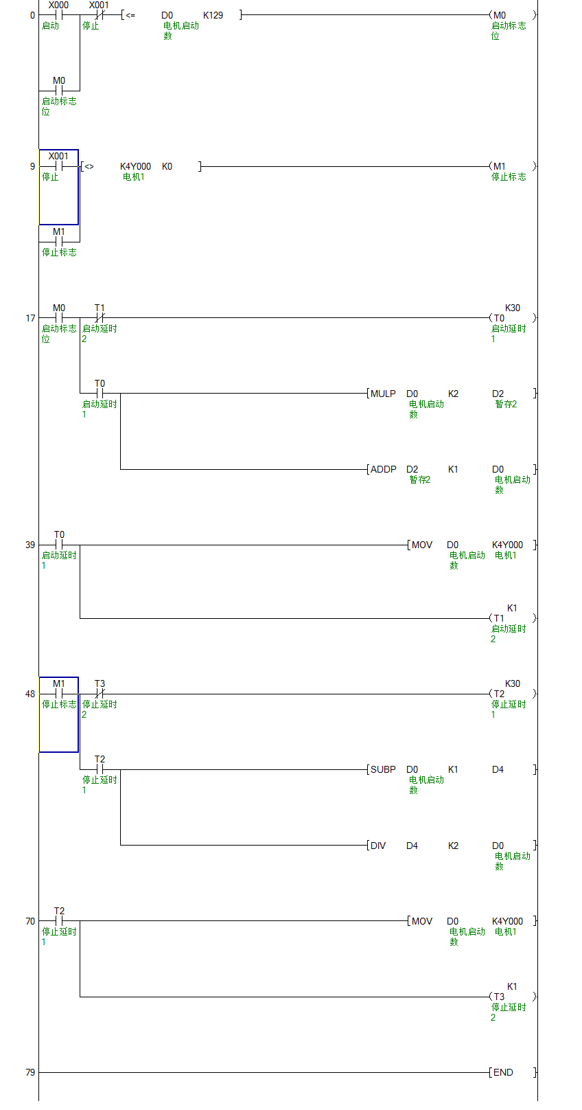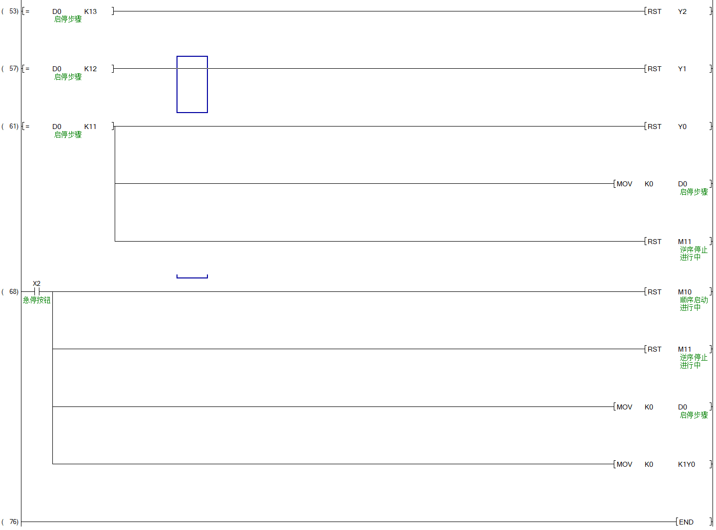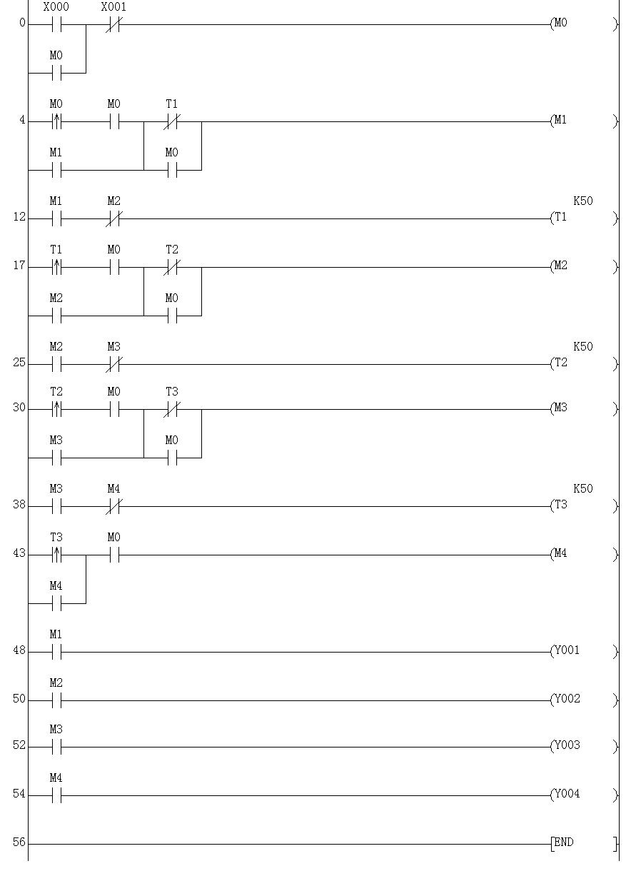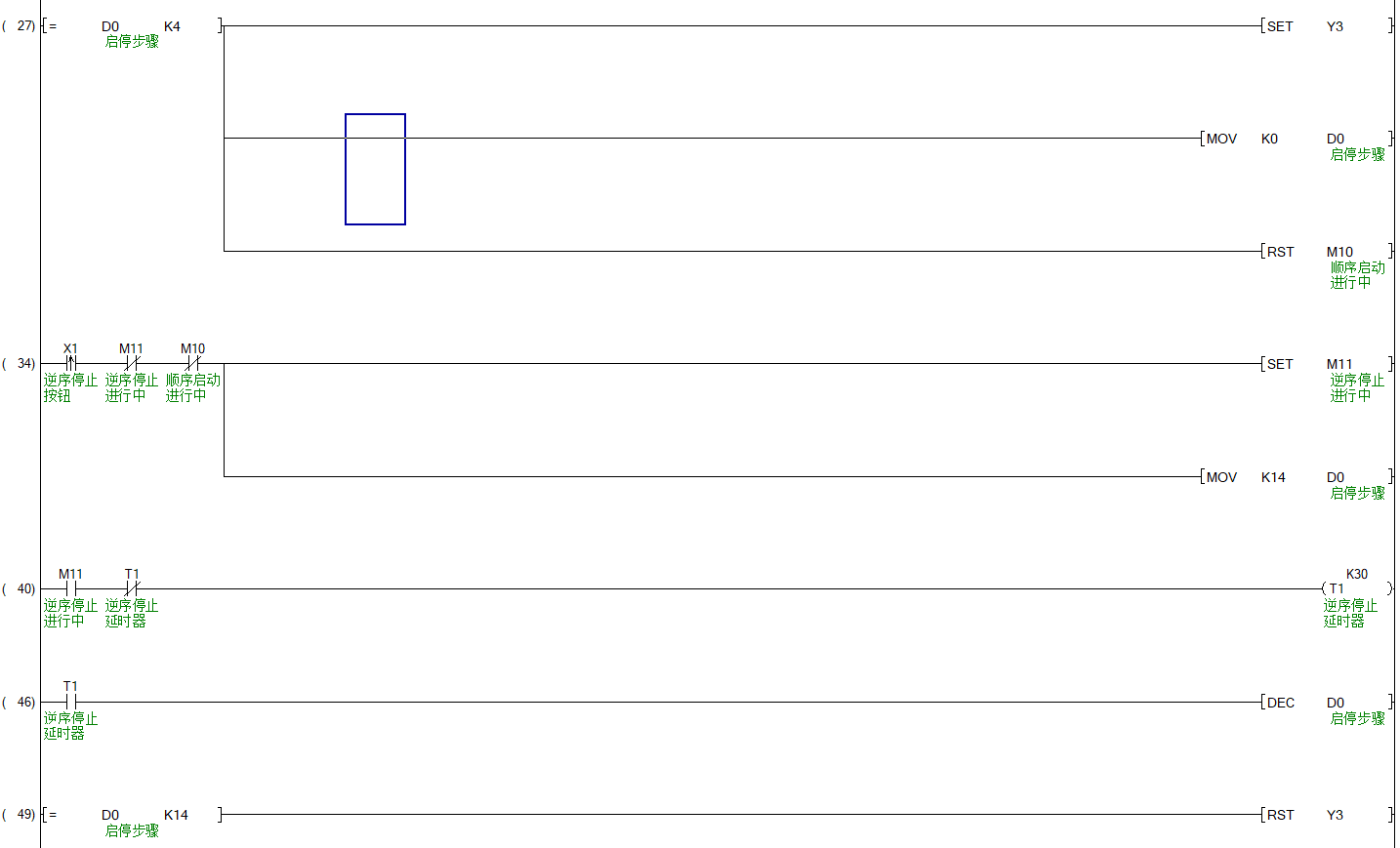 引用引用第2樓fcq417于2019-04-25 08:57發(fā)表的 :樓上的程序是3個(gè)點(diǎn)同時(shí)輸出,同時(shí)停止。你的反應(yīng)沒有掃描周期快的。順序啟動(dòng),逆序停止,可以采用樓主的方式,也可以采用作標(biāo)記的方式,即當(dāng)前啟動(dòng)的是Y0還是Y1等,通過判斷寄存器中數(shù)值來依次執(zhí)行電機(jī)啟停動(dòng)作。學(xué)習(xí)plc編程,www.shuyanzdh.com