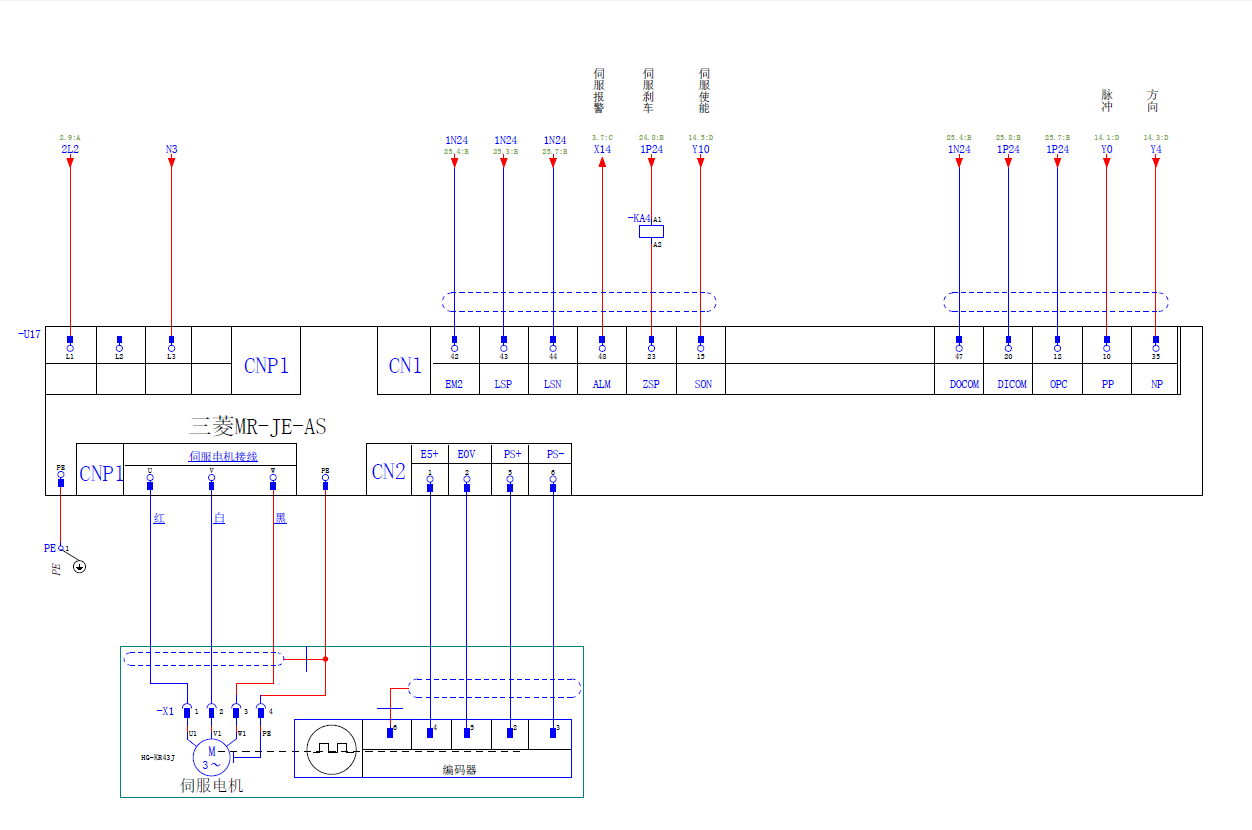 和FX3U一樣的 主要是: PLC脈沖Y0 連接伺服驅動器10號腳 ,PP PLC方向Y4 連接伺服驅動器35號腳 ,NP Y0和Y4的COM端,以及0V連接伺服的46號腳 24+連接伺服的20號腳和12號腳 看手冊 http://down.ymmfa.com/?id=400 拖到最后,看附錄 - 附錄1,有和J4的連接樣例, JE和J4的CN1一樣的。 |