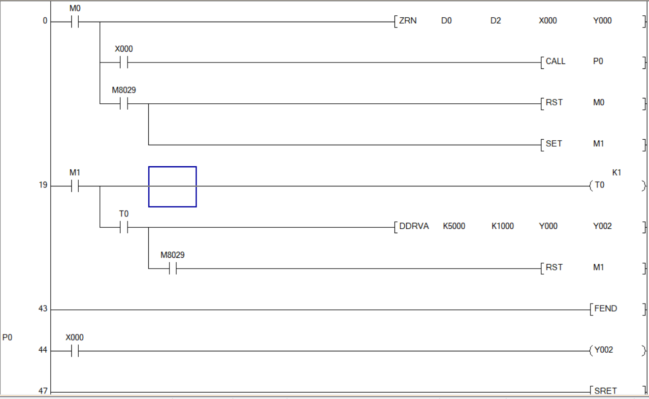 我想程序是從上到下執(zhí)行的,那我的子程序處的位置則是在ZRN下,DDRVA上,那ZRN執(zhí)行后,Y2為ON,執(zhí)行DDRVA,即使為-5000個脈沖,那它是還是會往負向走,不是往正向走,L因為ZRN時Y2=ON,到DDRVA時,Y2=OFF,這有沒有問題呢?只是DDRVA是不受周期影響,那到執(zhí)行DDRVA時,Y2是ON,還是OFF呢?感謝,趕明試下