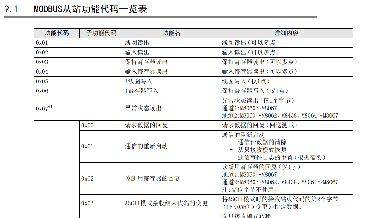 三菱的FX MODBUS從站說明上列舉的這些功能碼,指的是它目前僅支持這些功能碼,也就只會這些。你要給它別的,它不一定懂。