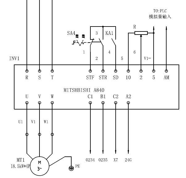 A840變頻器的AM模擬量輸出,直接連到FX5U自帶的模擬量輸入,用來檢測變頻器輸出頻率。