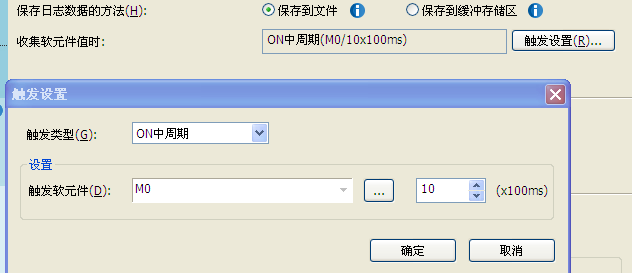 第二步,觸發設置,觸發有多種方式。樣例中使用的是ON中周期:M0接錯的時候,每1秒保存一次
