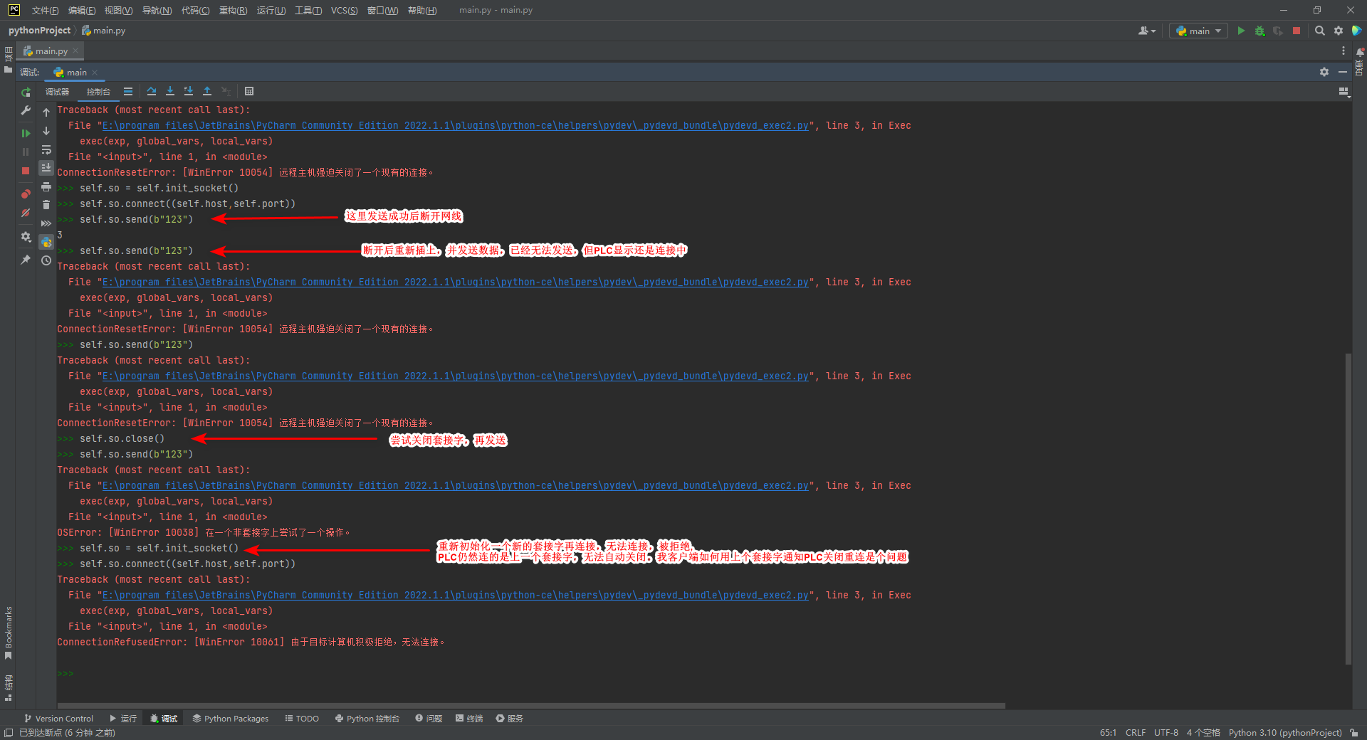 Close前面已經有兩次Send是斷線后發的,提示遠程主機中止連接。但又沒法Connect,因為我的套件字已經Connect了。所以只能初始化重新嘗試連接。