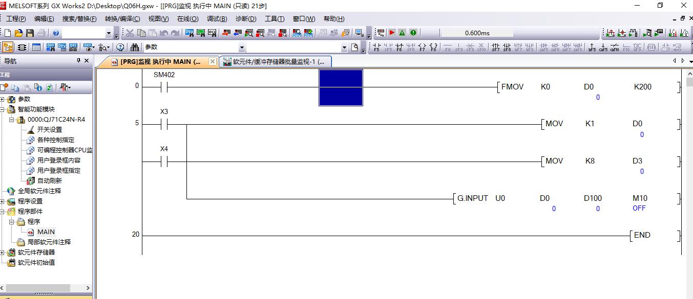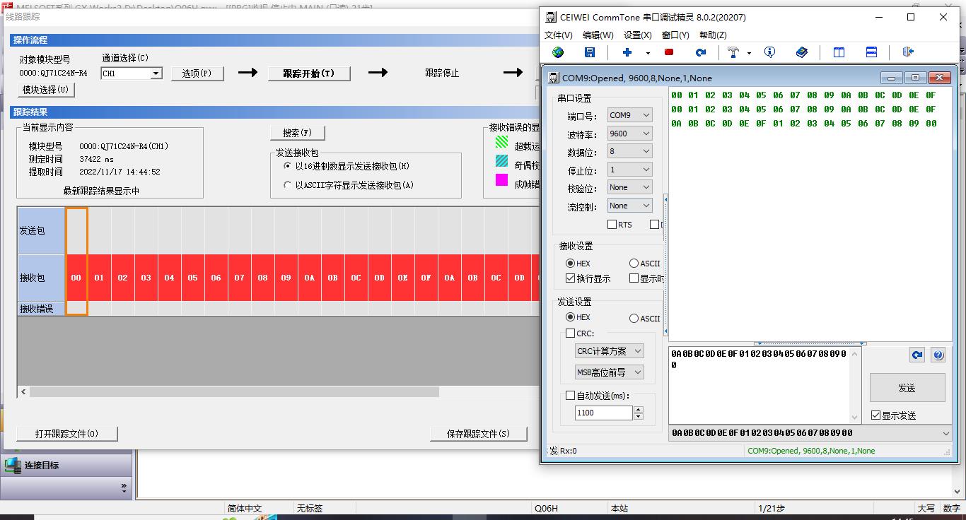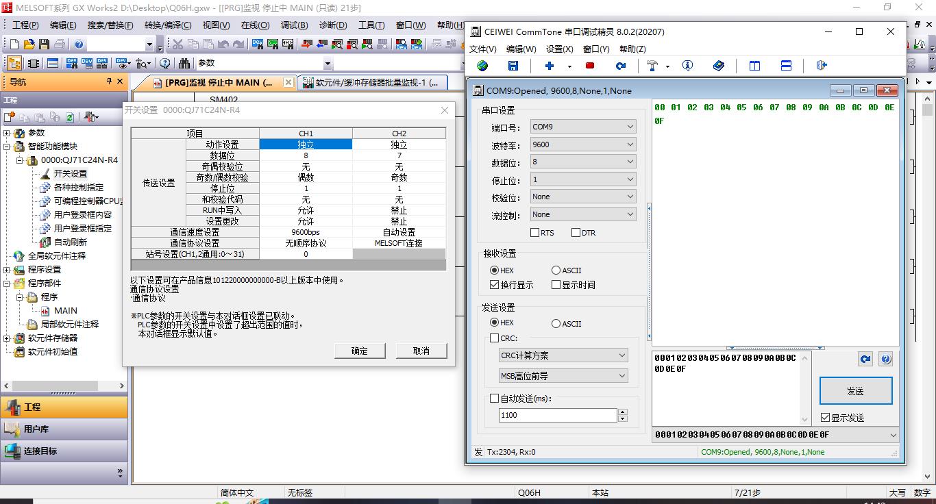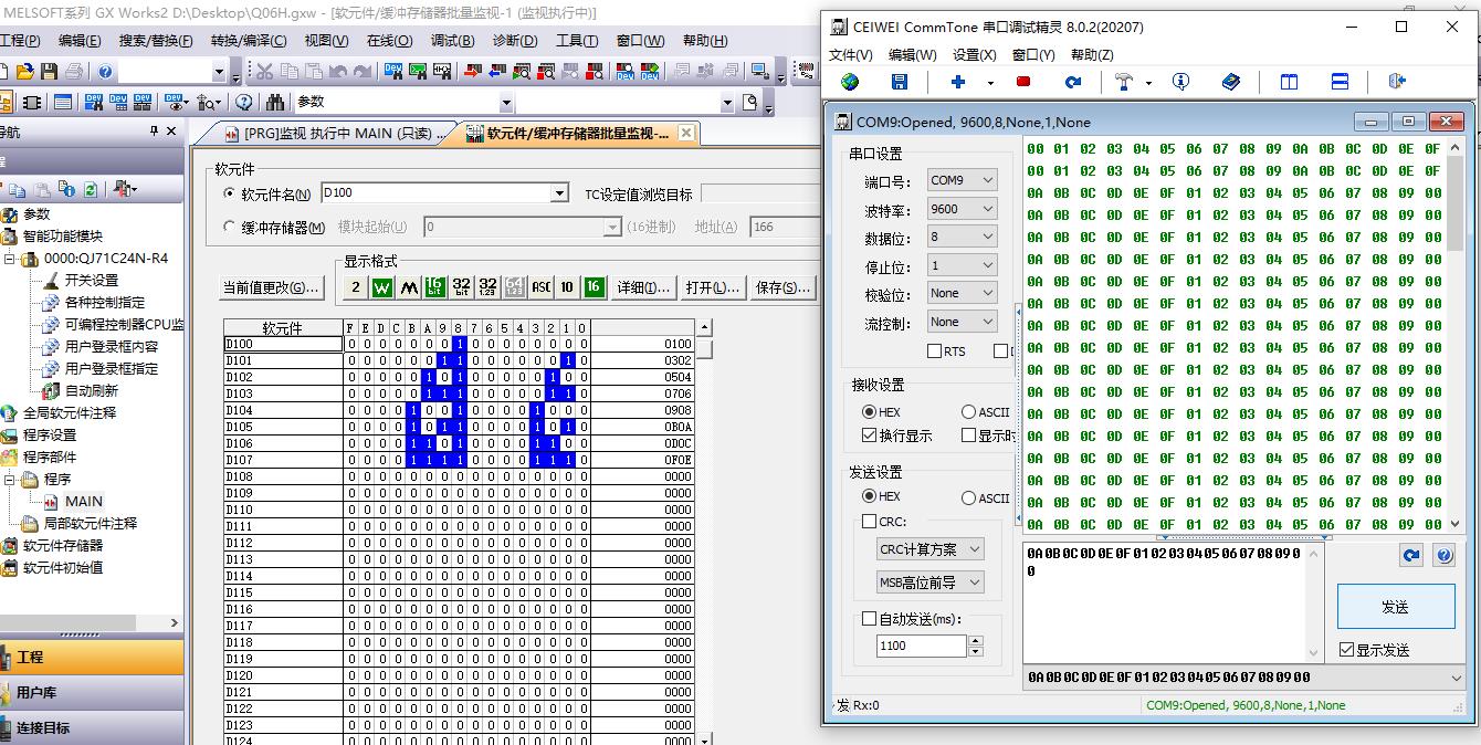 各位彭于晏胡歌吳彥祖幫小弟看看,通過串口調試軟件向485模塊發送數據,模塊線路跟蹤已經檢測到軟件發送過來的數據,但模塊的X3接收請求標志位確沒有變ON,寄存器也沒法接收到數據          調試軟件發送很多次才能在D100里看到接收過來的數據,再后面也是不斷的點發送才能看到一次接收成功,且接收的字節順序亂了              PLC向調試軟件發送正常,就是接收出現這種問題         走485無協議通訊   模塊QJ71C24N-R4   腦闊疼