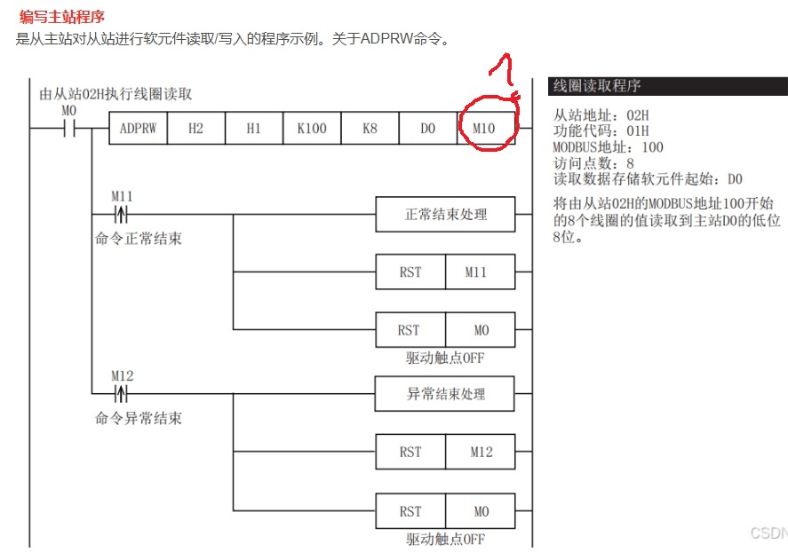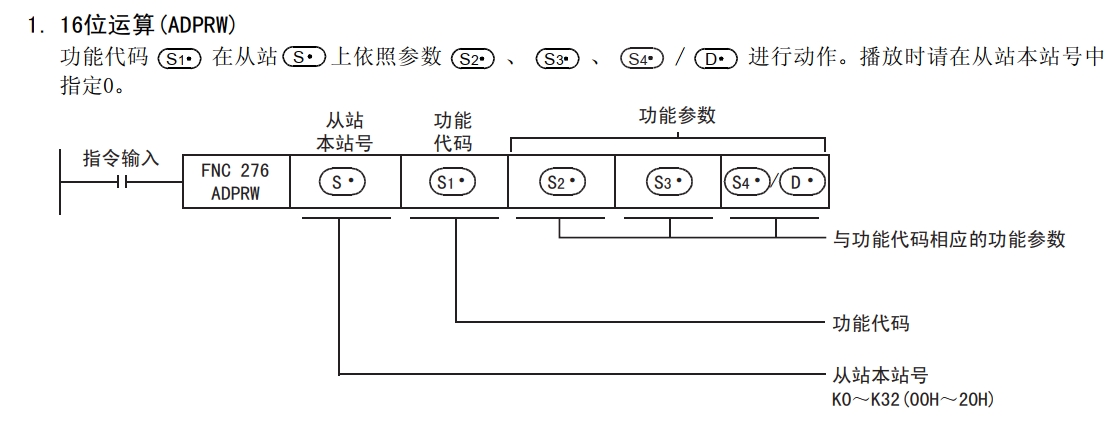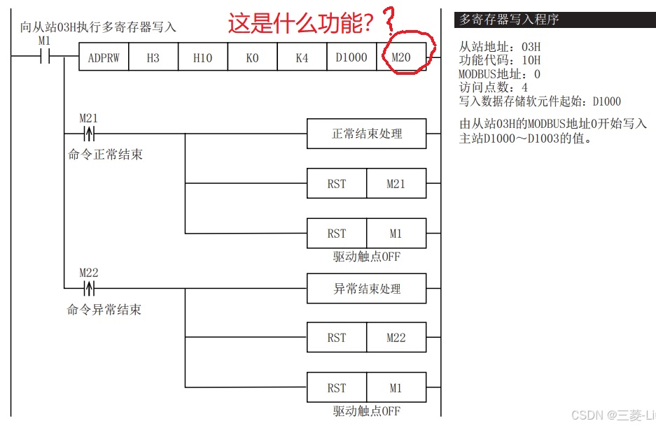 最近在學習FX3U的Modbus功能,突然看到其它大神的一段程序示例,不明白ADPRW指令的最后一個數據D是什么功能,