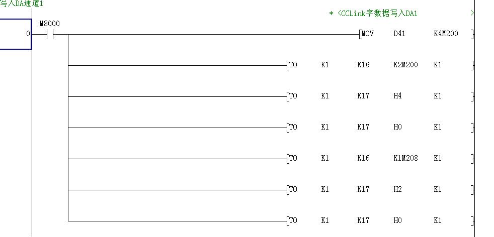 當(dāng)M8000接通時(shí),將PLC的K2M200(M200~M207)傳送到1號(hào)單元中的特殊功能模塊的BFM29號(hào)中,傳送字為1個(gè)