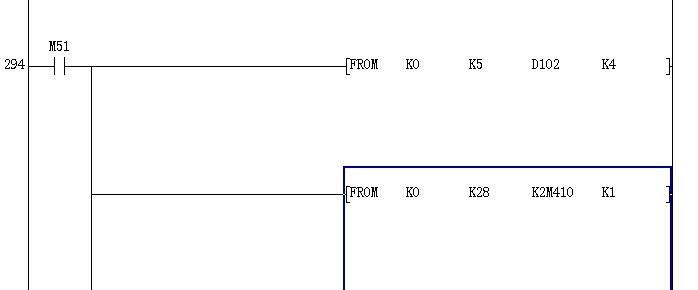 k0為0#功能塊,k28為模塊的緩沖存儲器的起始地址,k2m410存儲被讀取數據的軟元件起始號,k1為讀取1個字。
