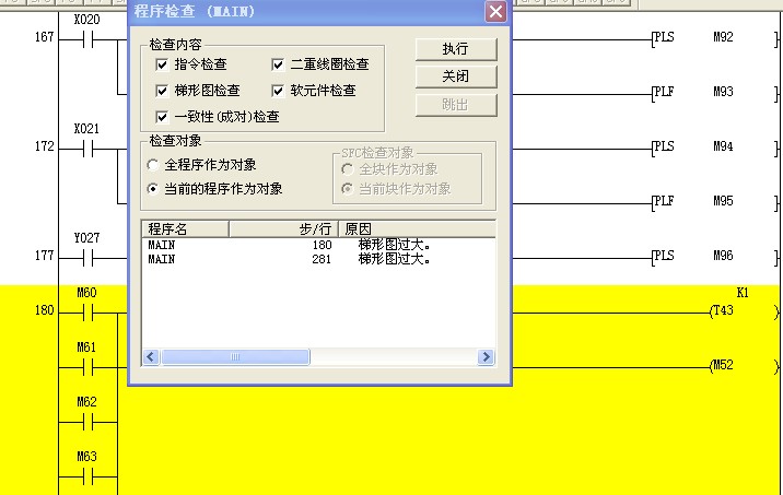 提示告訴你你的程序行數超限,對于GPPW來說,其一個輸出點最多并聯輸入點位24行,而FXGP軟件中無此限制。