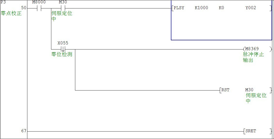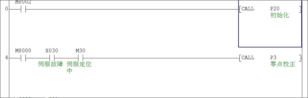 我剛剛接觸三菱PLC編的一個簡單的程序 在初始化的時候M30和Y5都是置位的 但程序導入FX3UPLC后上電后零點校正正常 當零位檢測后伺服電機停轉脈沖停止 M30復位后啟動主程序中的M1伺服電機就是不動 請問各位大哥大俠 誰能幫我分析一下這個程序那里有問題 小弟先謝過了