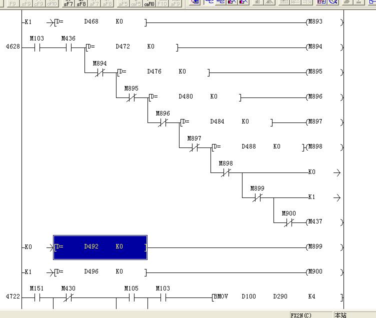 鼠標點擊地方前面的K0是連接上面K0的,點擊處是32位比較指令,如果寄存器的值等于0就接通后面的繼電器
