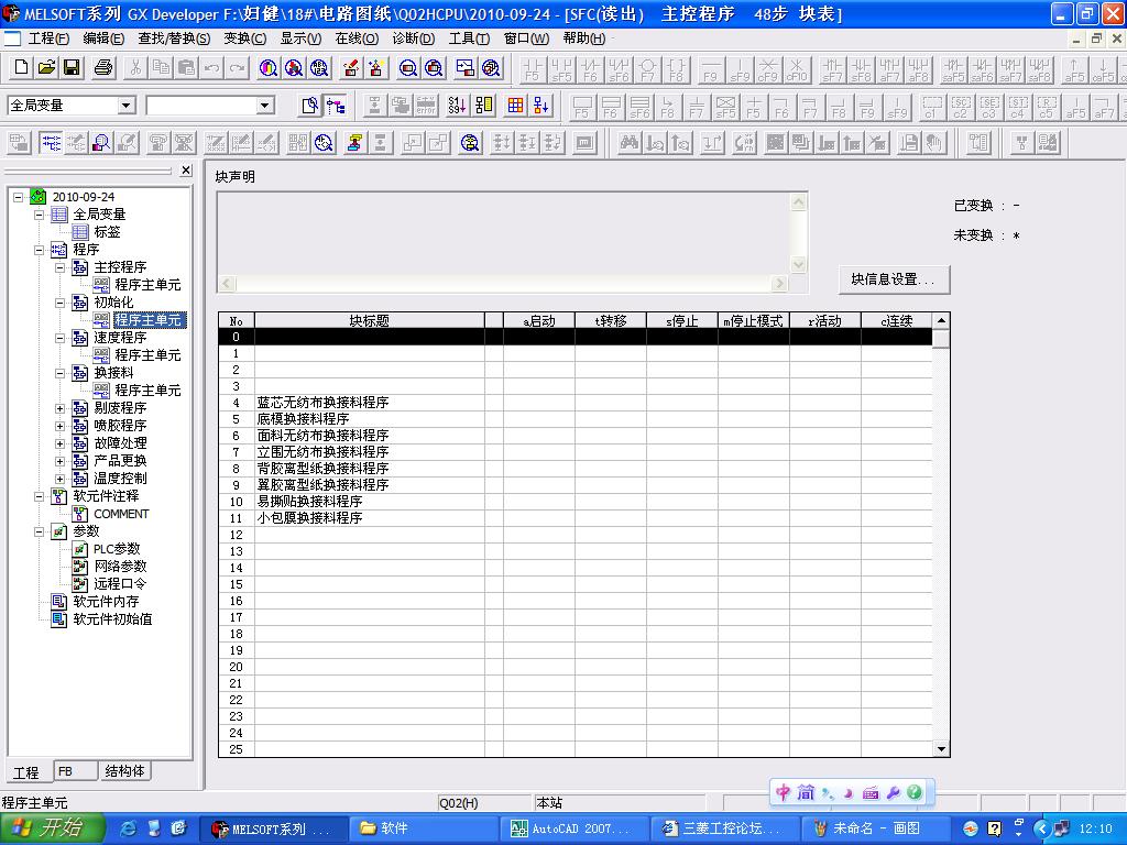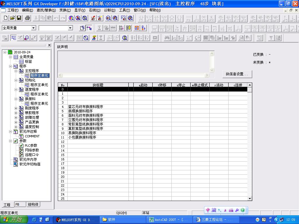 我現(xiàn)在用GX 8.86G編程,用的是Q系列CPU,在用SFC語言編程,在編寫多個(gè)程序的時(shí)候,在我命名了一個(gè)程序中的一個(gè)塊的"塊標(biāo)題",在其他程序相同塊的"塊標(biāo)題" 也被命名相同的塊標(biāo)題,這個(gè)如何解決呢? 是到底改什么參數(shù)才可以能夠不同程序的塊標(biāo)題是不相同的呢?我在步的注釋就可以把 "BL"軟元件的注釋改成"各元件的注釋",就可以解決,可就是不知道"塊標(biāo)題"有沒有對應(yīng)的軟元件,大家有沒有遇過這樣的問題呢?