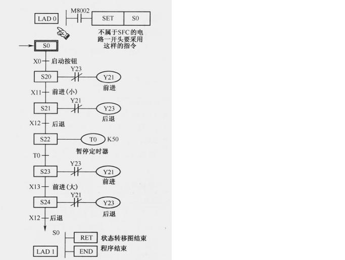 如圖所示,順序功能圖的頭和尾端有的加部分梯形圖,有的沒有,感覺比較亂?加梯形圖好象是在編程軟件中因為初始步必須用梯形圖加頭,尾端有的加RET和END,這里感覺標準不太統一。