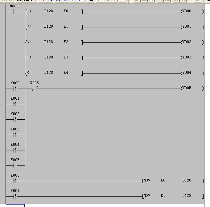 作業內容:有5臺電機(Y0---Y4),正常4臺工作1臺輪流休息。檢測故障信號(X0----X4),當檢測到有1臺電機故障時,保證4臺電機工作,停止故障電機并報警(Y5)!!大家來幫忙做下這個作業!!