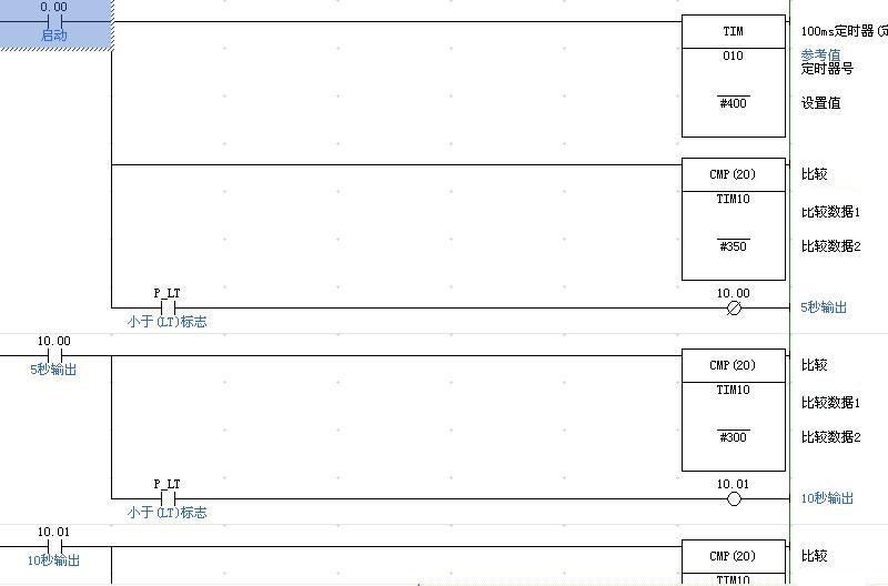 想學習一下比較指令CMP然后使用25507標志位輸出 ,寫入這個指令后發現TIM后面的010(第一行除外)總是缺少一個0,本身練習一下5、10、15、40(40秒是一個參考值)秒輸出,寫入PLC(CPM1A,輸出端子空著)后接通電源后10.00指示燈亮。5秒后滅,估計40秒后10.03亮,不知道是編寫指令有誤還是步驟問題?謝謝!!!