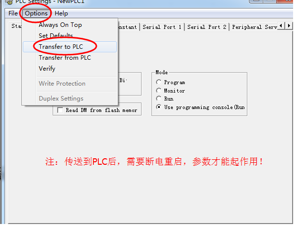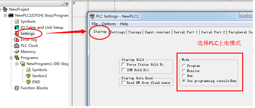 調試過程中碰到一個難題!!! 就是CP1H PLC每次上電后沒有轉到運行或者監控模式!只能用電腦先切換到運行或者監控模式才能有效,不知道是不是PLC中設置了什么??