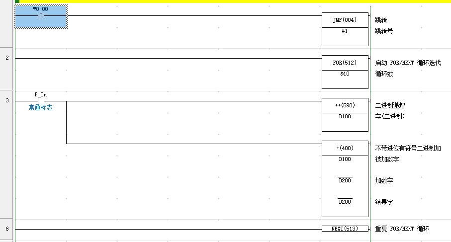 當(dāng)W0.00按下時,由于循環(huán),D100的值會分別從1變化到10,D200用于累加D100的變化,也就是說,每次會累加55。