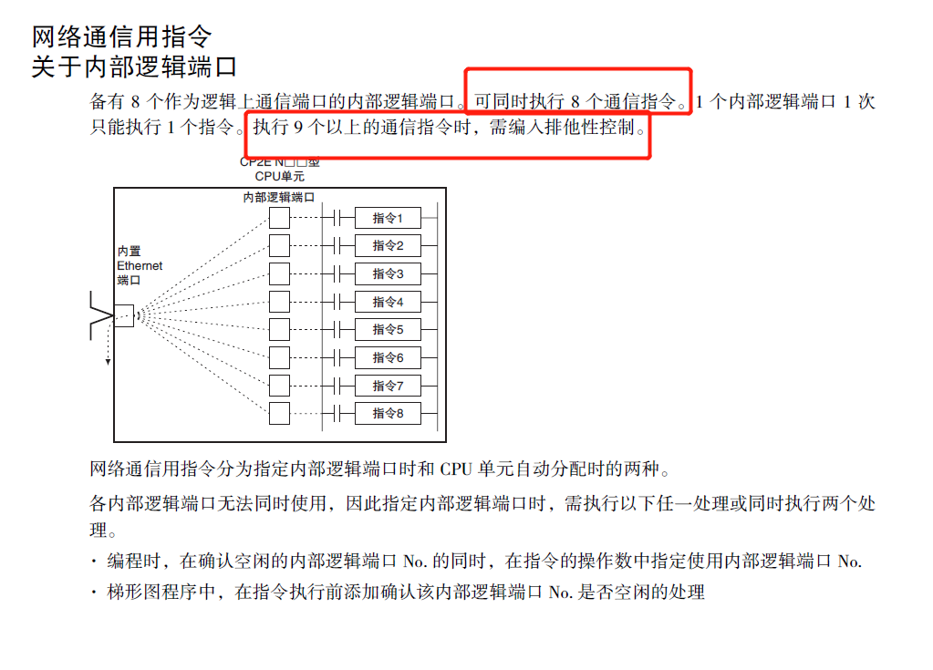 CP2E-N手冊說FINS通信中RECV和SEND指令可以同時使用8個指令,PLC備有8 個作為邏輯上通信端口的內(nèi)部邏輯端口?赏瑫r執(zhí)行8 個通信指令。但是實際使用時有問題