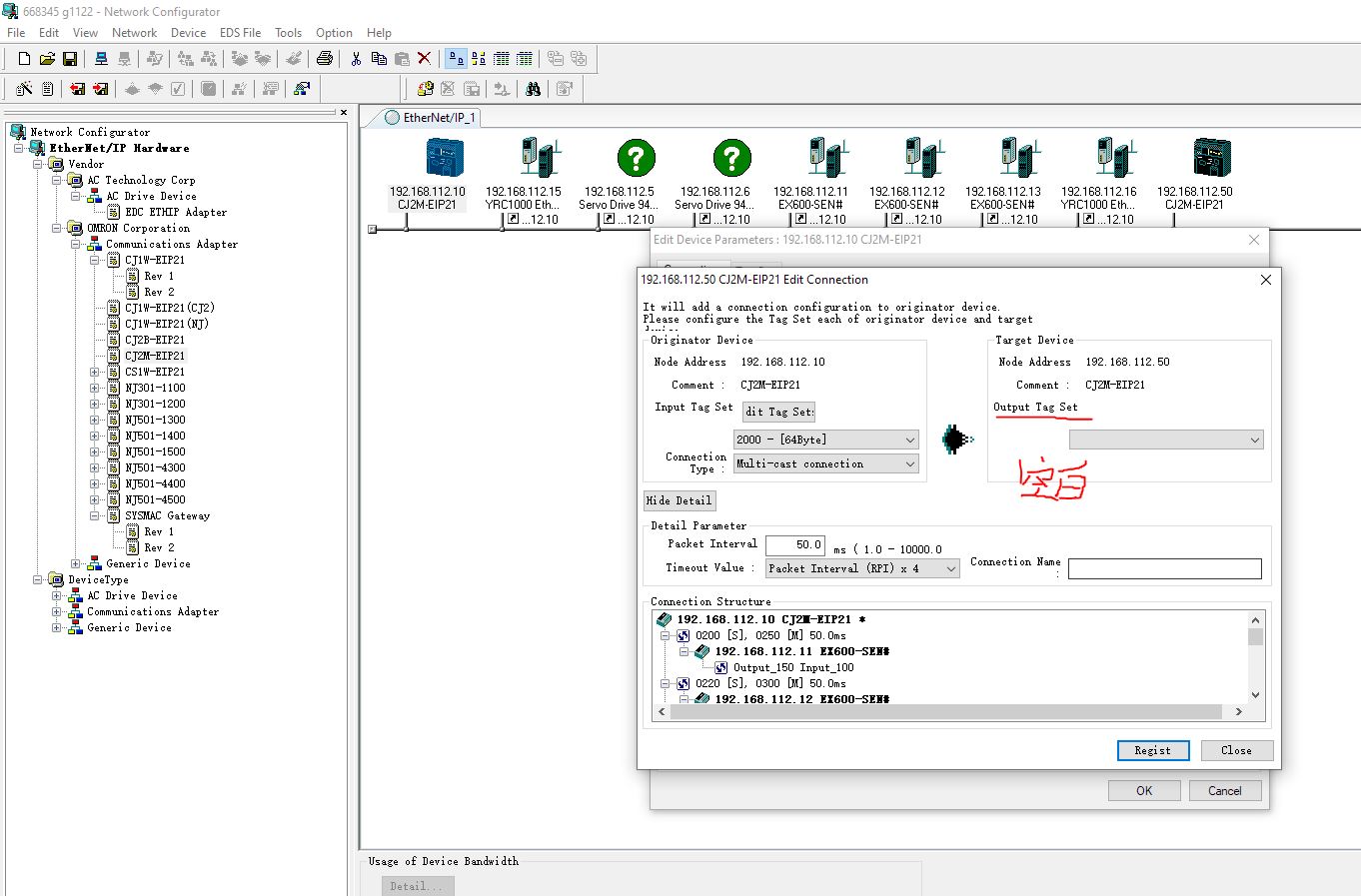 然后將CJ2M的網絡公開變量導出,再導入NetworkConfigurator中。然后上面圖片的位置,就會有input/output tag set可以選擇。