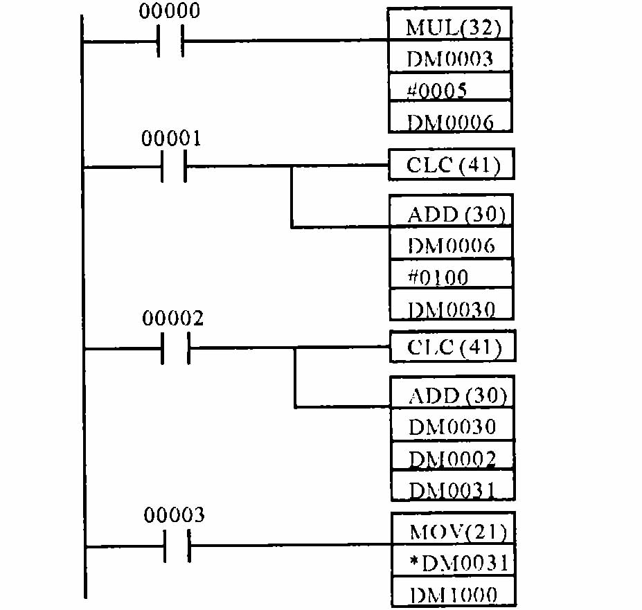 其中MOV 3 DM0031 DM1000 是間接尋址指令,它將DM0031 的內容(即通過計算得到的控制