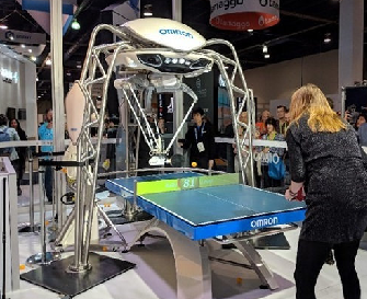 機器人公司歐姆龍(Omron)通過生動有趣的方式展示其技術——這是一款名叫Forpheus的機器人乒乓球大師。該機器人使用兩個攝影機來追蹤球的位置和速度,采用專利的預測模型計算球的運動軌跡,以保持與人類對手的來回對抗。還有一個額外的攝影機追蹤人類玩家的臉部表情,判斷他們是否享受這一游戲過程,以確保這是一場有趣的比賽。雖然這并不意味著它是一個商用產品,但是表明人工智能、感測和先進的機器人技術可以應用于各種工業(yè)和消費功能上。