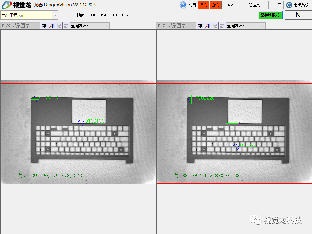 采用“龍睿型”的視覺定位技術,對筆電C件的型號進行定位識別,然后視覺將坐標信息與產品型號發送給PLC,引導機械手進行上料和激光打標。
