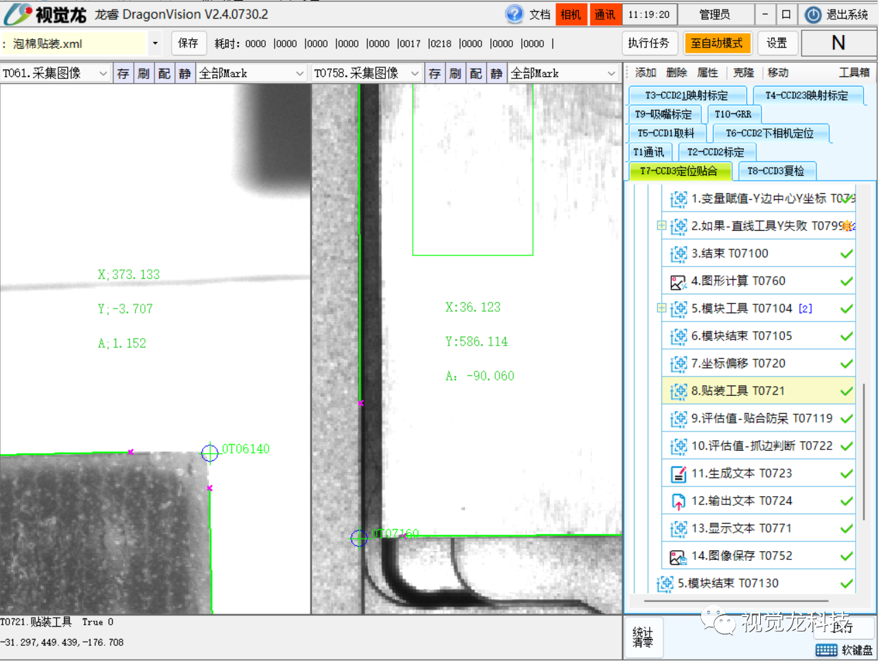 采用“龍睿型”的視覺對位貼合和飛拍技術,通過多工位多相機分別對產品的不同區域元件進行定位,同時對輔料進行位置識別,從而引導機械手/模組進行輔料貼合與復檢。