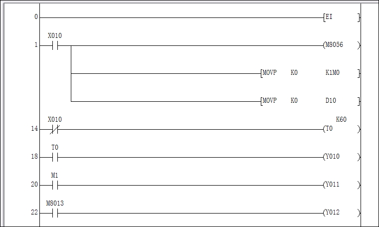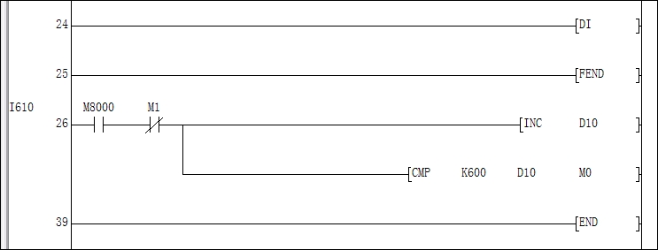 EI允許中斷,DI禁止中斷,且須寫在程序首行。I610表示每10毫秒執(zhí)行一次中斷指令,即每10毫秒D10自加1,并與常數(shù)K600比較,相等時M1導通,即Y11導通10毫秒,X10為清零功能,不明白樓主在24步加DI的用意。看錯了M1導通后不再繼續(xù)自加,Y11一直導通,直到X10接通。