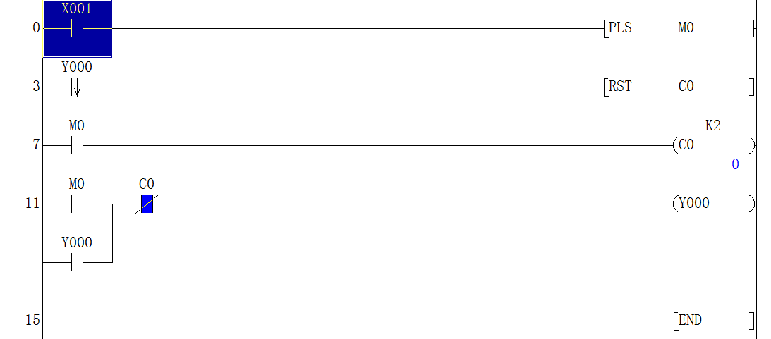 Y0和T0構(gòu)成互鎖,按一下X0啟動(dòng),再按一下X0停止,如此循環(huán)啟動(dòng)停止