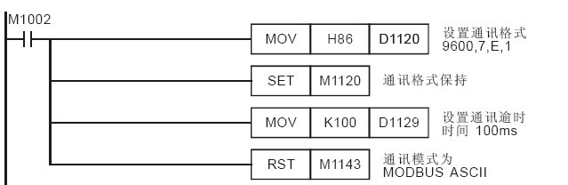 上圖是臺(tái)達(dá)plc和觸摸屏通訊的一段程序, H86=10000110(二進(jìn)制數(shù))其對(duì)應(yīng)的通訊格式為9600(波特率)7(數(shù)據(jù)位)E(偶校驗(yàn)