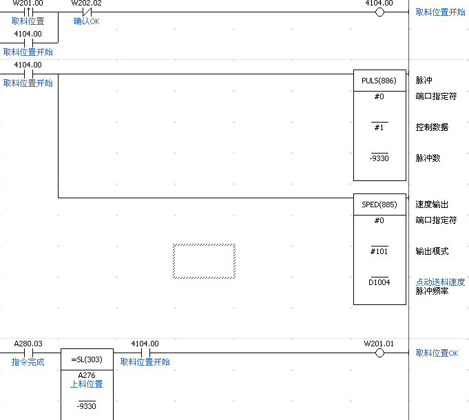 如圖此段程序,按下按鈕后,電機正常走動,結(jié)束后A280.03 =SL 和4104.00 都ON的,為什么w201.00顯示還不能ON?想不明白~~~ |