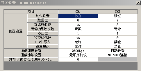 通過編程編程軟件對QJ71C24N的5個通信開關設定,232-設定1#、2#號,485-設定3#、4#,開關內容包含通信速率、傳輸格式以及傳輸協議。