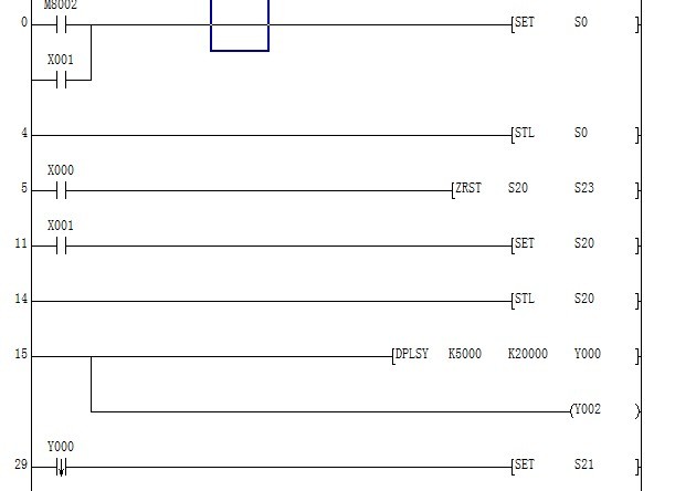 注明:X0為復(fù)位按鈕,X1為啟動按鈕。Y2、Y3為正反轉(zhuǎn)指示燈。程序如下: