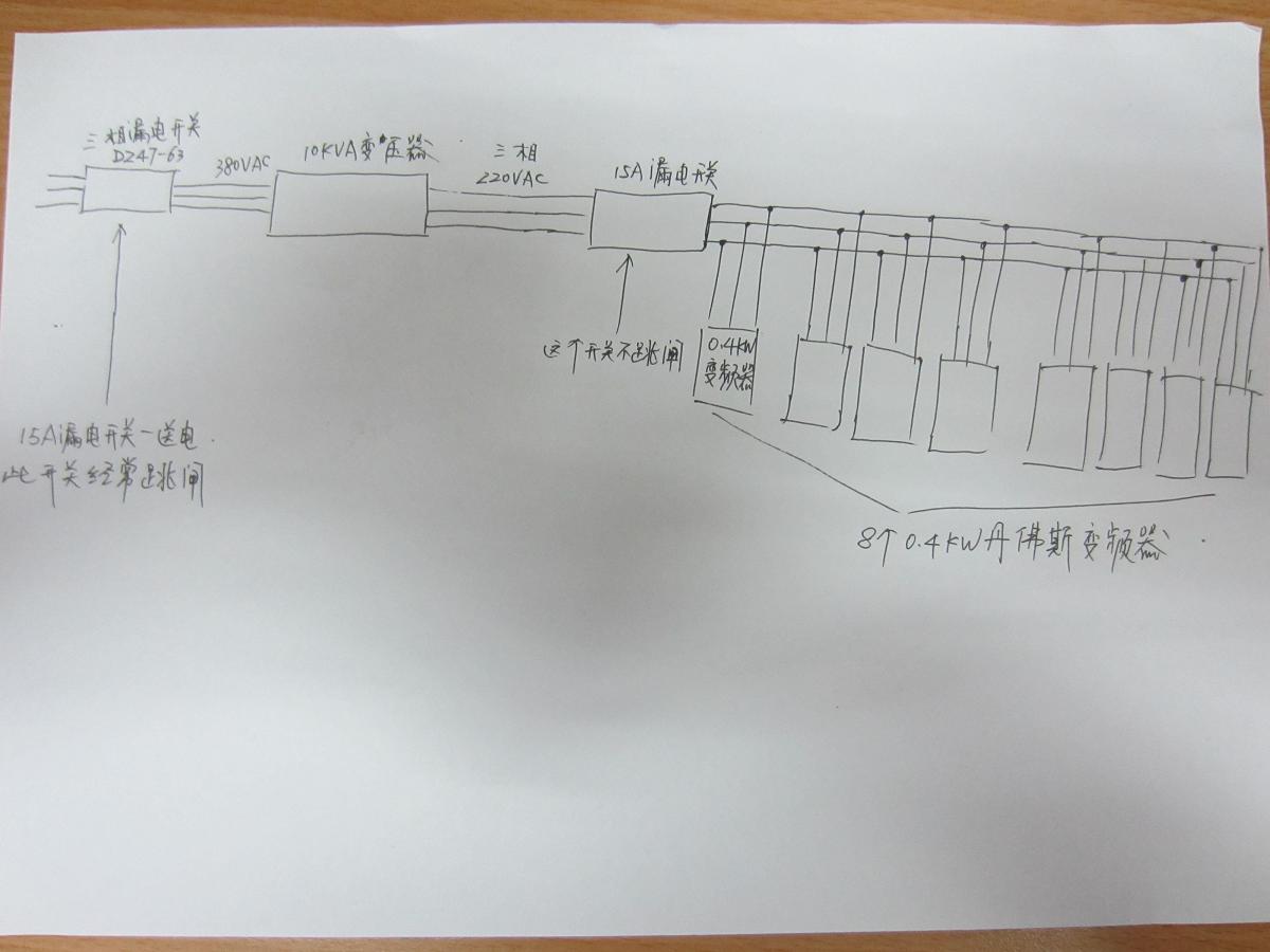 一臺設備由一個15A的漏電開開關直接控制8臺 3相220VAC   0.4KW丹佛斯的變頻器, 給這臺設備供電的是一臺由DZ47-63( C63 )三相漏電開關控制的10KVA 三相380VAC變三相220VAC的變壓器