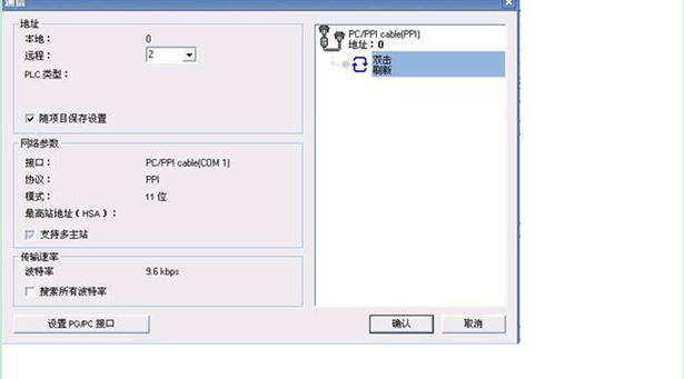 雙擊刷新之后,軟件會找到連接上電的200CPU,同時將它的通訊參數顯示到左側,如果plc的地址不是2,那么在“遠程:”后面的下拉框要選擇新搜索的地址。