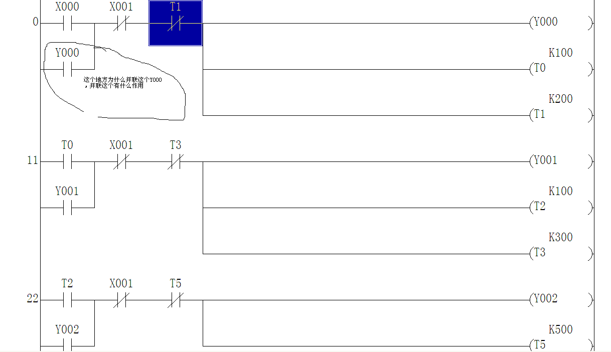 我是剛學習這個PLc的,看到一個定時步進電路,這里面并聯的Y0是什么意思,為什么要并聯這個Y0?哪位能給我做個解釋啊,謝謝!!!! LD X0 OR Y0 ANI X1 ANI T1 OUT Y0 OUT T0 K100 OUT T1 K200 (這是其中的一段) |