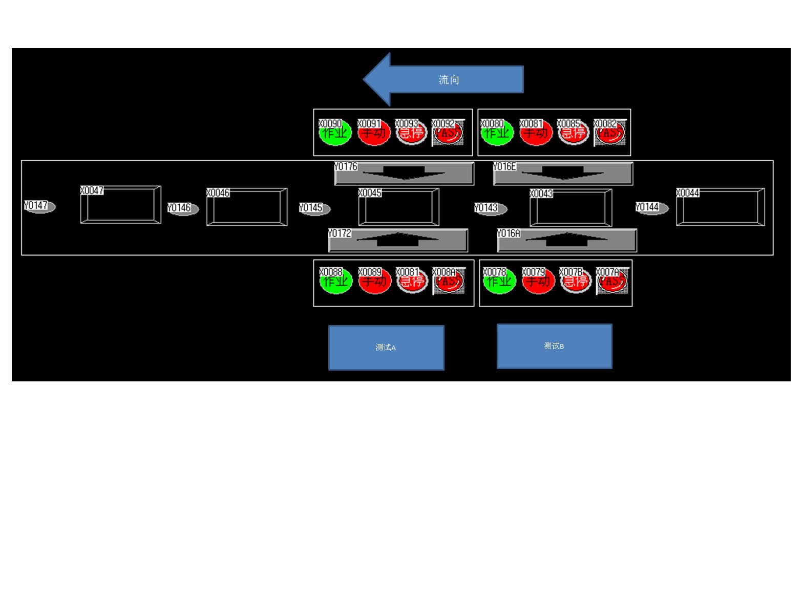 2、若測試A進行中時,測試B進入備用狀態(tài)。若第二塊棧板進入,測試B到位即進行測試。測試B直到PC給PASS信號,即可放行