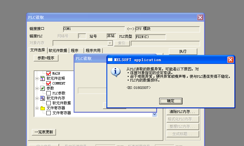 如果是這個PLC本身就有程序,有條件先弄其他同型號PLC排除線和通訊設置的問題吧。