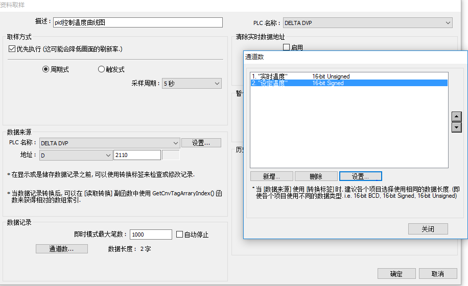 先建立采樣資料,然后建立趨勢圖的時候,選數據來源就選你建立的采樣資料,別說兩條曲線,8條曲線都能顯示出來。