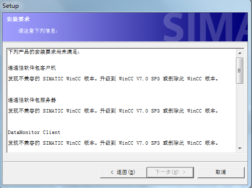 系統為win7 64位 sp1系統,已經裝好博圖V13,step v5.5 sp2 cn ,需要使用wincc,所以開始安裝,但是一直出現以下情況,第一張圖全選就會出現第三章圖的問題,第一張圖只選第一個,出來第二張圖會發現什么都安裝不了,為什么啊,急!!!!