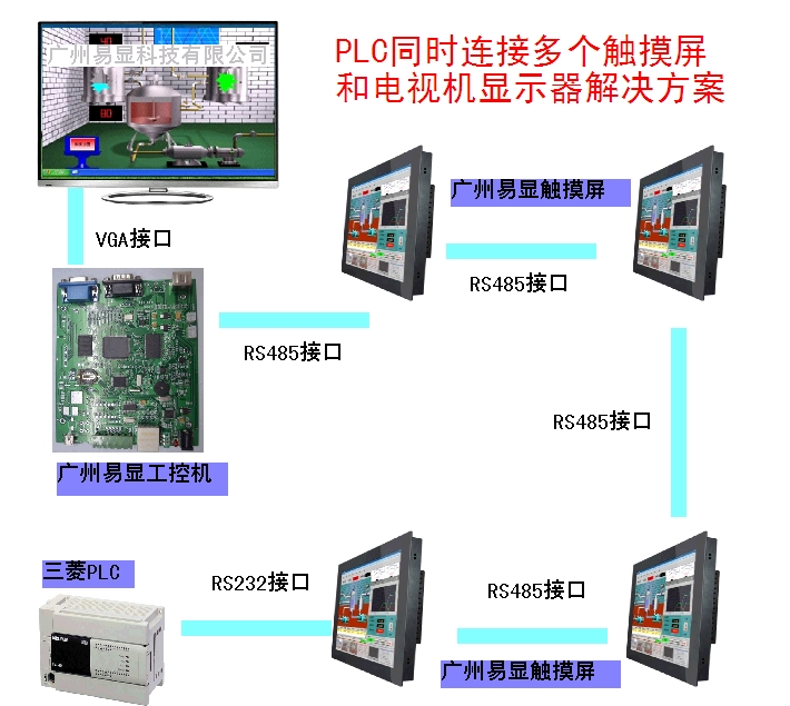 廣州易顯的觸摸屏(工控機)與三菱PLC聯接時,可以用232接口與PLC連接,廣州易顯的觸摸屏(工控機)另一個485接口可以和第二個廣州易顯的觸摸屏(工控機)的485接口連接,第二個廣州易顯的觸摸屏(工控機)的485接口又可以和第三個廣州易顯的觸摸屏(工控機)的485連接,這樣可以聯接無數個觸摸屏或者VGA接口的電視機顯示器。