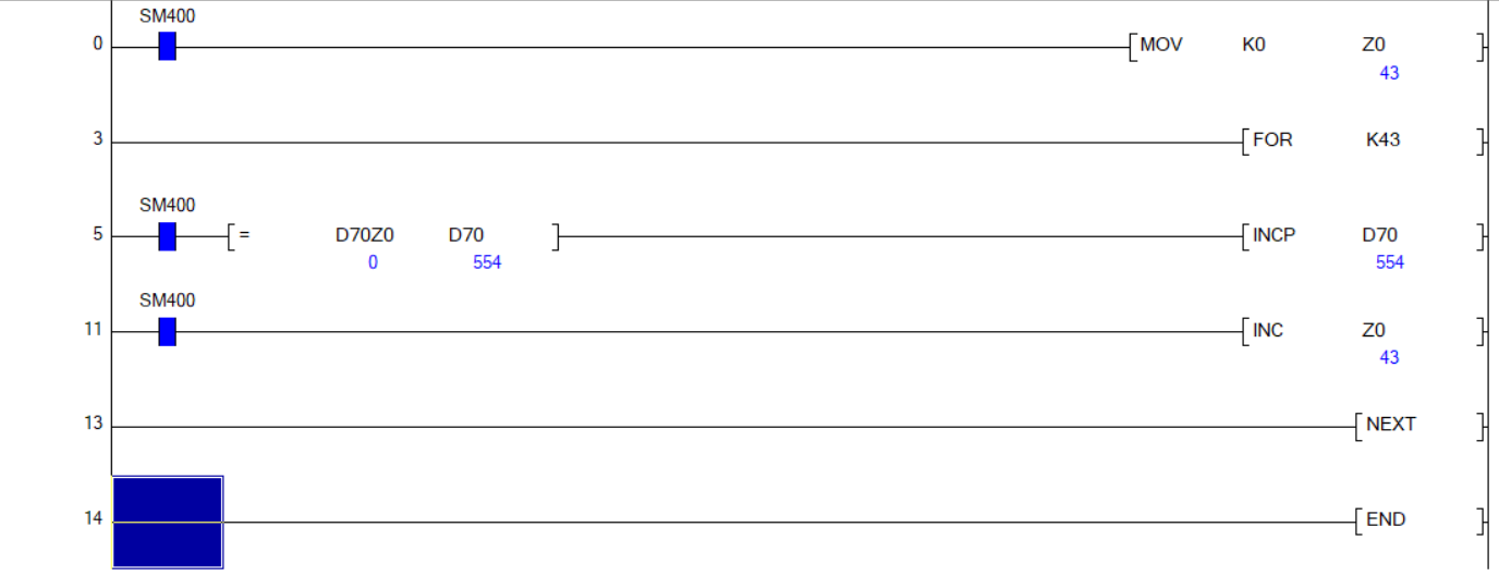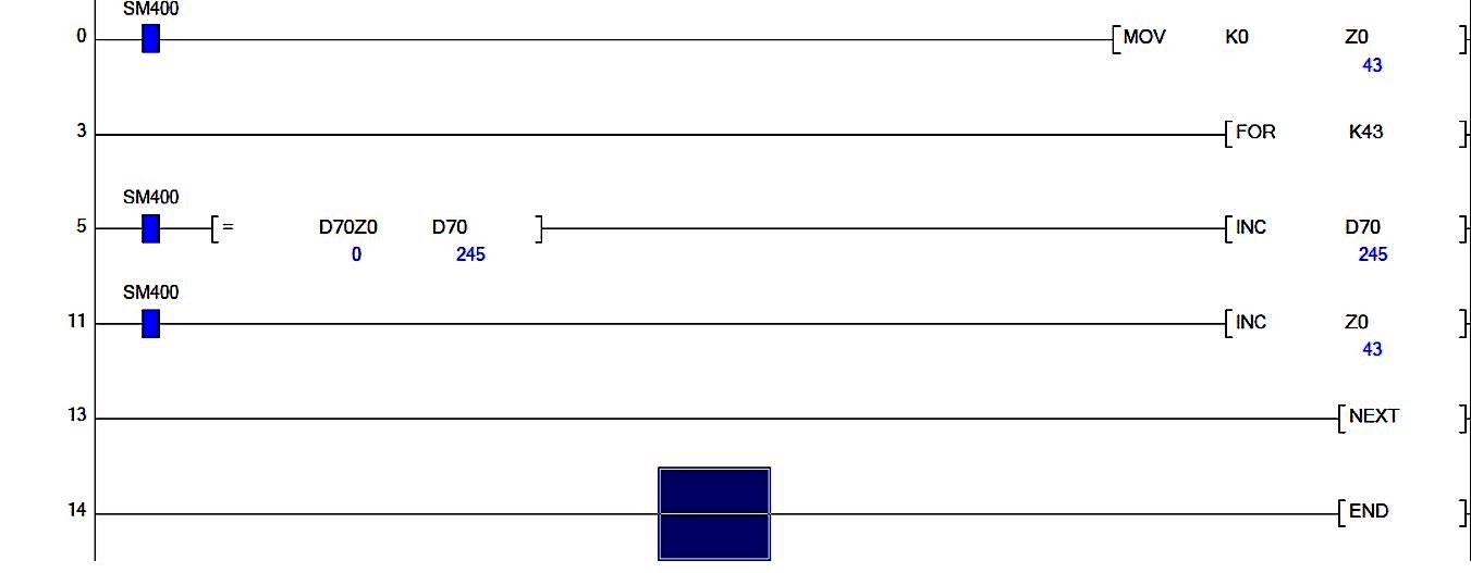 先說第一個掃描周期,第一行Z0為0,執行到第二行,進行43次循環,第0次循環時,執行到第三行,此時由于Z0為0,所以條件= D70Z0 D70其實就是= D70 D70,顯然條件是成立的,所以INC D70就會加1,也就是 D70為1,之后執行第四行,Z0自加為1(Z0為1),,接著執行到第五行NEXT,但是由于沒有達到43次,所以再循環到第三行,(Z0=1)條件= D70Z0 D70其實就是=D71 D70,由于D70為1,D71為0(如果程序沒有對D71賦值),顯然條件不成立,不執行INC D70,D70還是1;之后執行第四行,Z0自加為1(Z0為2),接著執行到第五行NEXT,但是由于沒有達到43次,所以再循環到第三行,、、、、、、、、、之后都是不成立,等到執行完循環43次后;D0還是為1,Z0為43,程序執行完NEXT結束一個掃描周期
