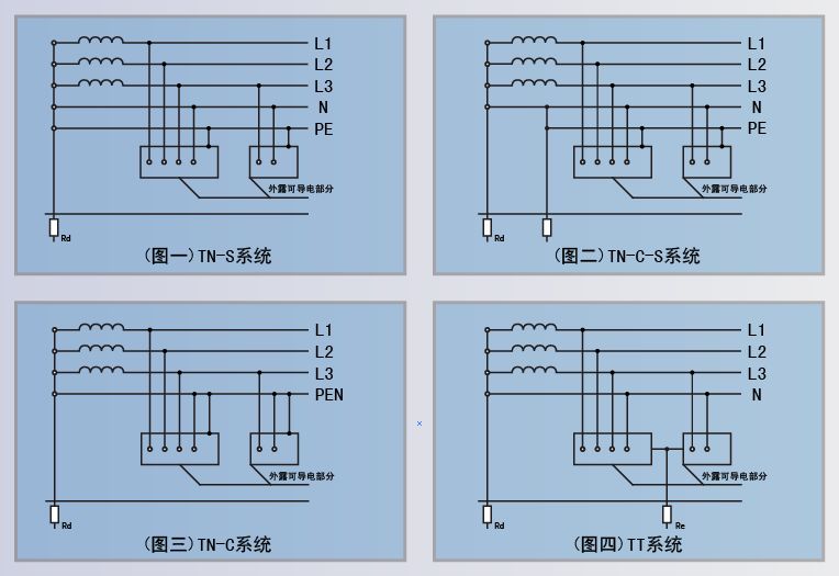 如果問到“新廠房要如何接地才規范”,上面四種方式都可以,各有優缺點。但是,現在通常以下面兩點為主。 1、配電室與車間廠房在同一建筑的,圖一的TN-S。 2、配電室與車間廠房不在同一建筑的,圖二的TN-C-S。 你的舊廠房“從變壓器拉電纜出來就三相線一零線,設備接地就是就近打一地線針1.5米”中,除了“打一地線針1.5米(應2.5米)”這一點不規范外,將地線打至2.5米以上就規范了,這就是圖四的TT系統。 |