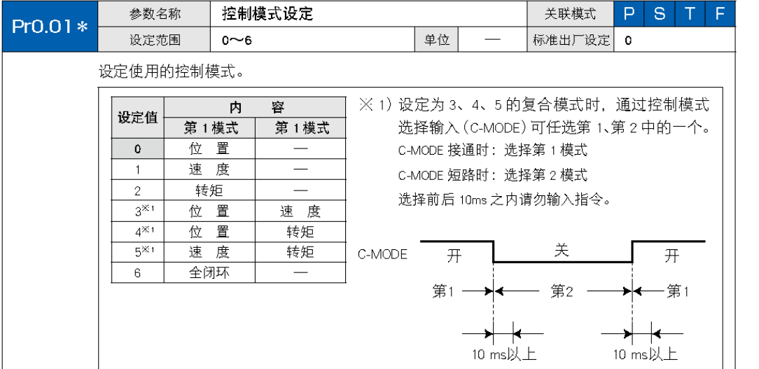 Pr0.01是控制模式設定,0-位置模式,1-速度模式,2-扭矩模式,3-位置、速度模式,4-位置、扭矩模式,5-速度、扭矩模式,6-全閉環模式。