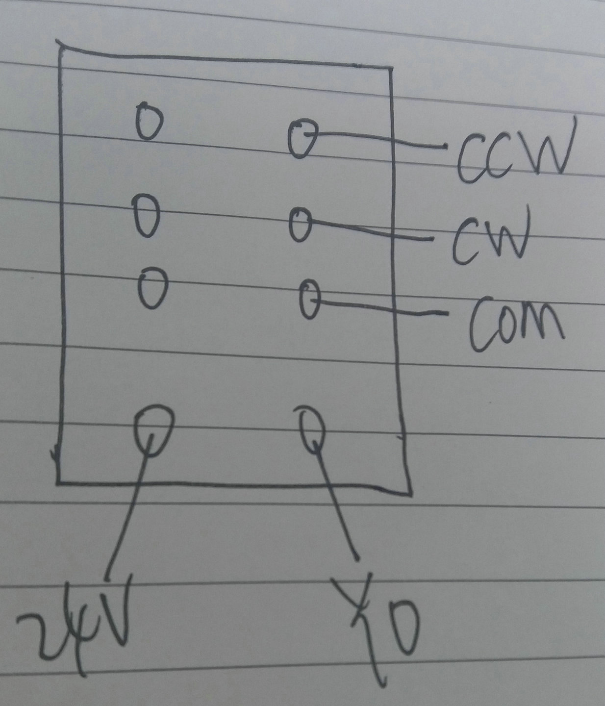 最好Y0Y1控制兩個(gè)繼電器,COM-CW 是正轉(zhuǎn),COM-CCW是反轉(zhuǎn)。如果只是用點(diǎn)動(dòng)的話(huà),就用一個(gè)繼電器也可以,繼電器COM接COM,NO和NC分別接CW和CCW。