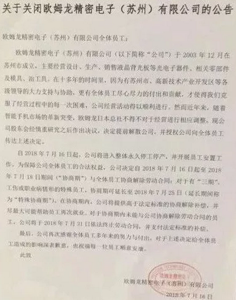 7月16日,日企歐姆龍精密電子(蘇州)有限公司發(fā)布公告,宣布?xì)W姆龍?zhí)K州工廠將從7月16日起進(jìn)入整體永久停工停產(chǎn),并開(kāi)展員工安置工作。這是繼尼康、日東電工、三星、奧林巴斯之后,年內(nèi)又一家世界級(jí)的企業(yè)巨頭宣布將要關(guān)閉中國(guó)工廠。